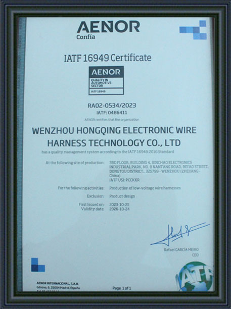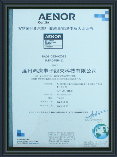 温州鸿庆电子线束科技有限公司成立于2015年12月,座落于浙南沿海国家AAAA级风景旅游区--百岛洞头。公司专业生产各种新能源纯电动公交车整车线束、纯电动客车整车线束、工程机械整机线束、特种车整车线束、控制器线束,倒车雷达线束,发动机线束、机器编织线束、电动踏板线束等。公司占地面积3000平方米,现有员工70多人。是浙江省科技型中小企业。公司已取得商标注册证书,拥有实用新型专利10项,通过了IATF16949:2016汽车行业质量体系认证。